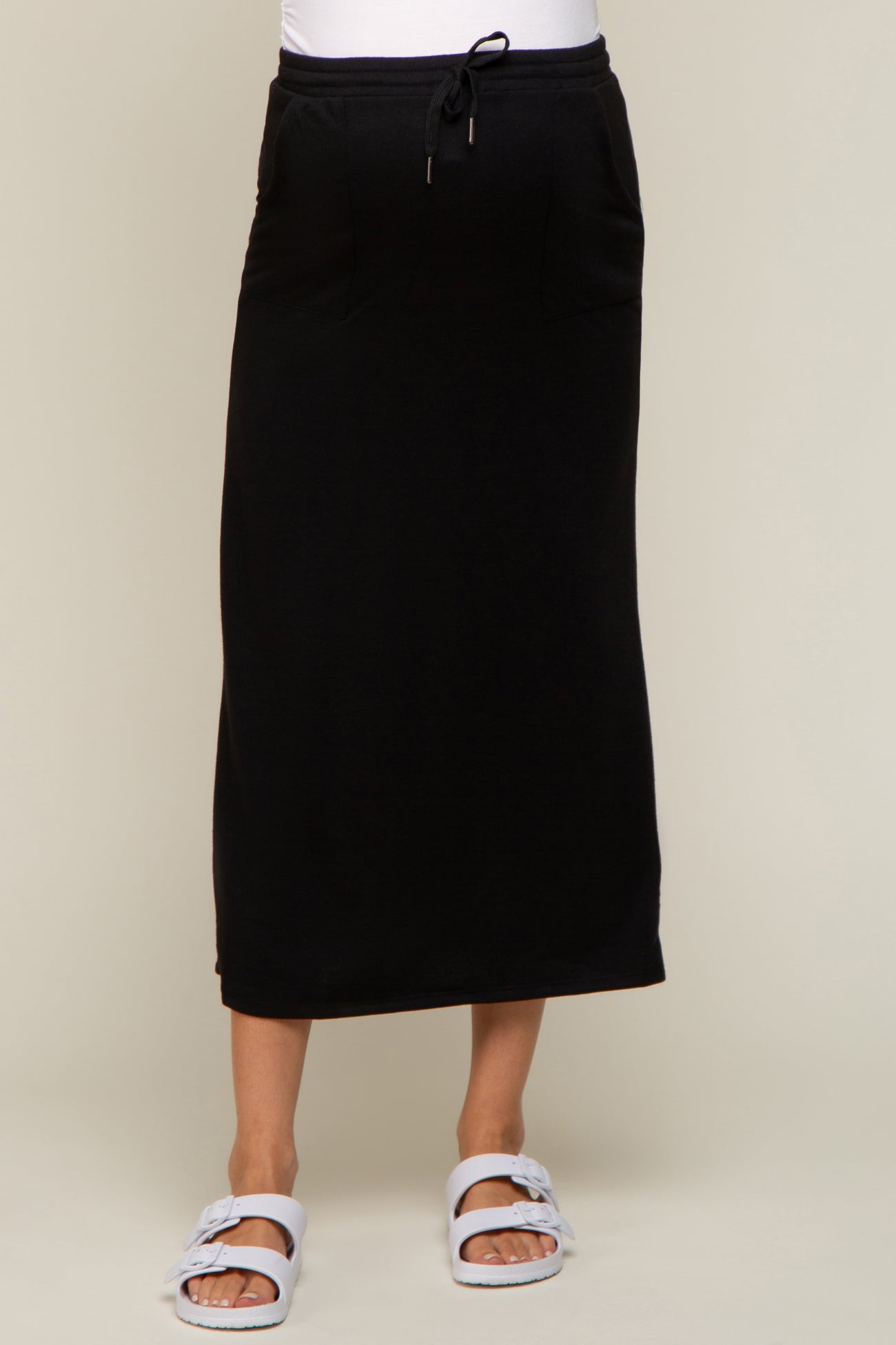 A fleece knit maternity maxi skirt featuring an elastic waistband, an adjustable drawstring and a back slit.