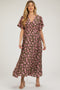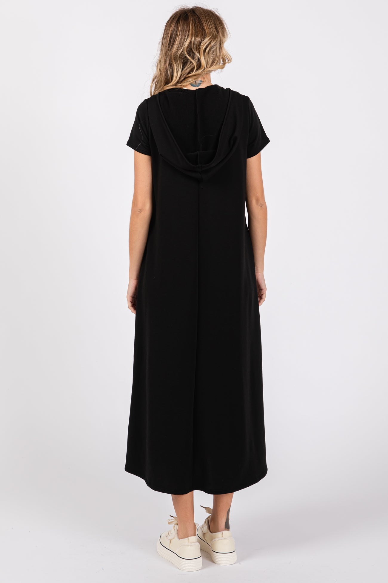 A fleece knit midi dress with a v-neckline, short sleeves, a hood, and side pockets.