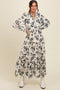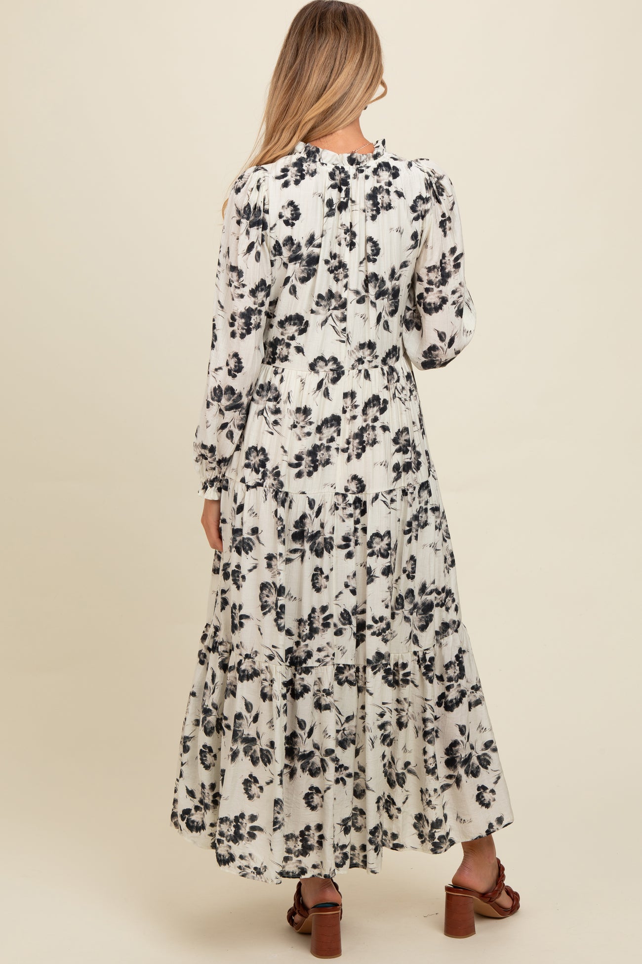 Embrace effortless style and comfort with our Black Floral Button Front Tiered Long Sleeve Maternity Maxi Dress. Featuring a delicate black floral print on a soft cream background, this maxi dress is designed with a flattering tiered silhouette that accommodates your growing bump. The button-front detailing adds a charming touch, while the long sleeves provide coverage for cooler days. Crafted from lightweight, breathable fabric, it offers all-day comfort from pregnancy to postpartum. Perfect for casual outings or special occasions, pair it with your favorite sandals or heels for a chic maternity look.