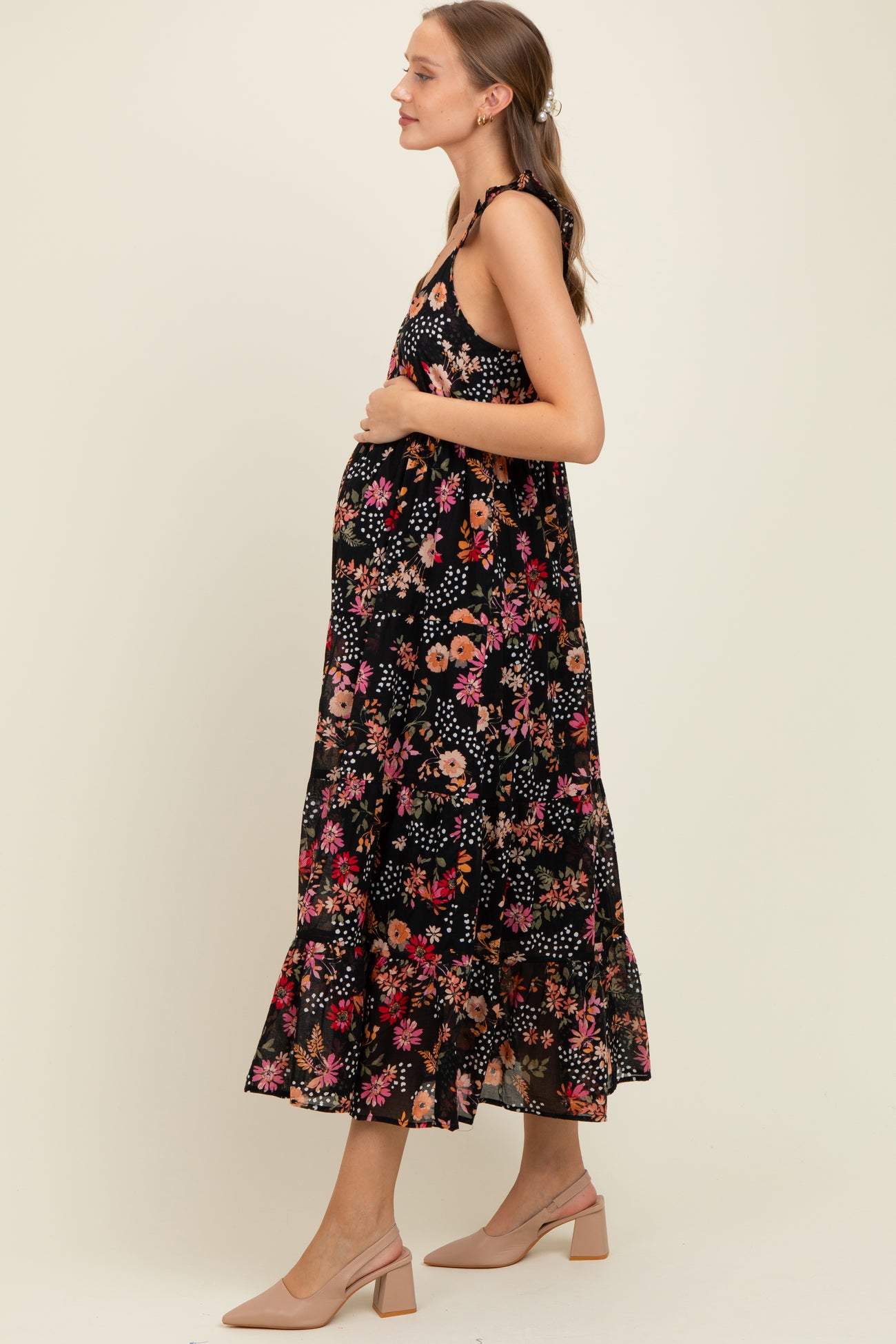 Black Floral Chiffon Button Front Maternity Midi Dress