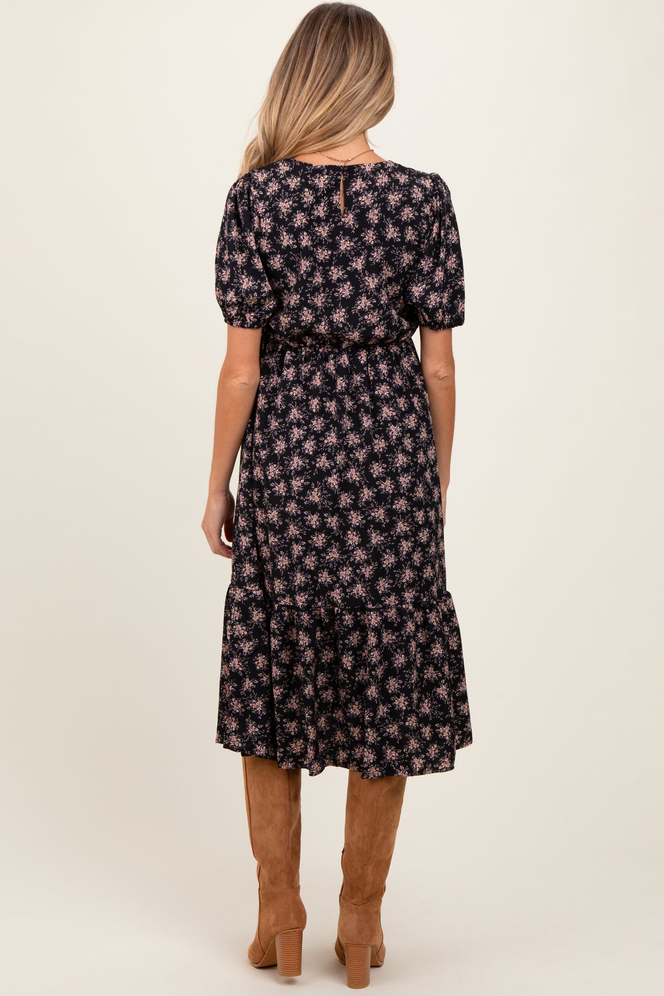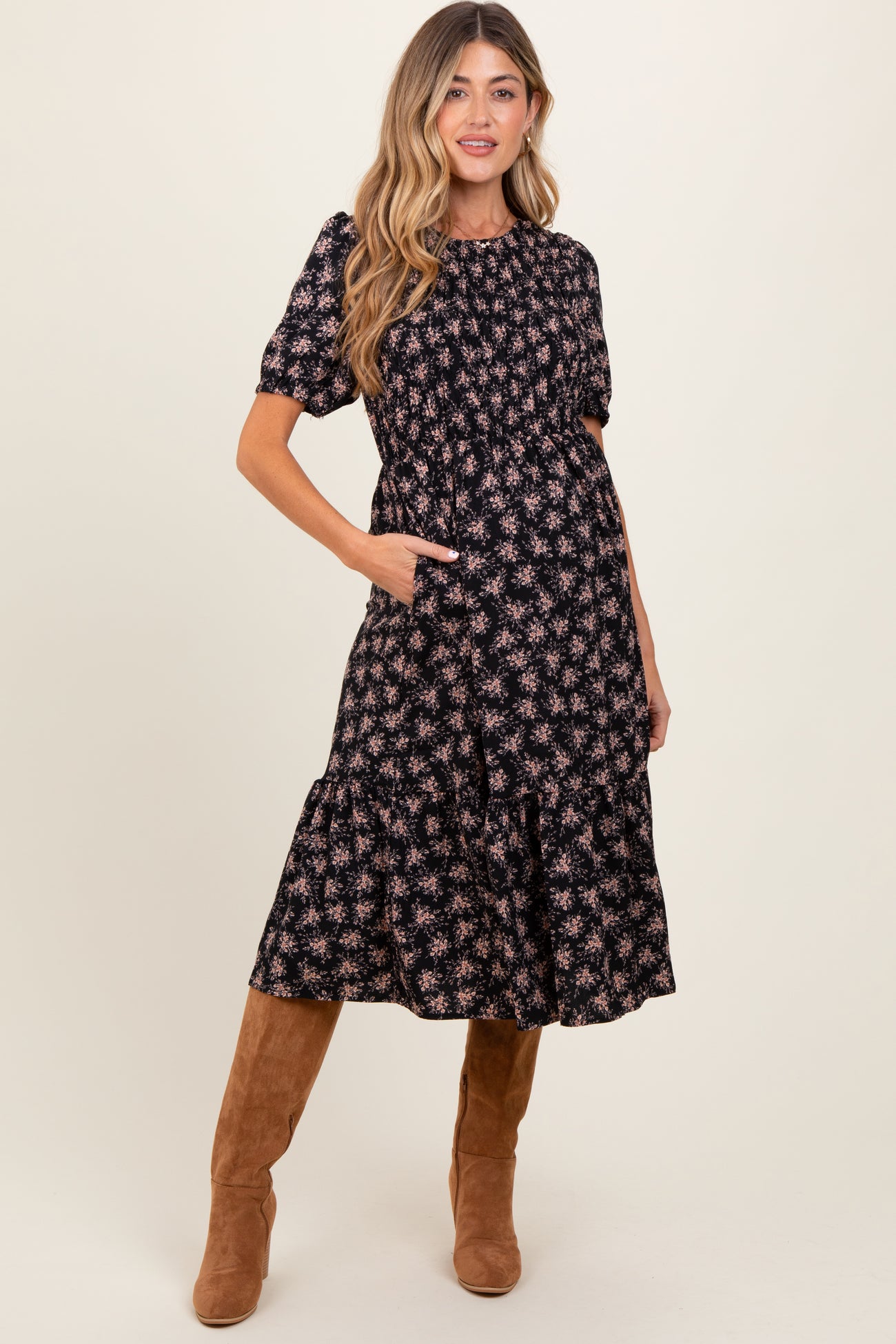 Black Floral Puff Sleeve Smocked Maternity Midi Dress