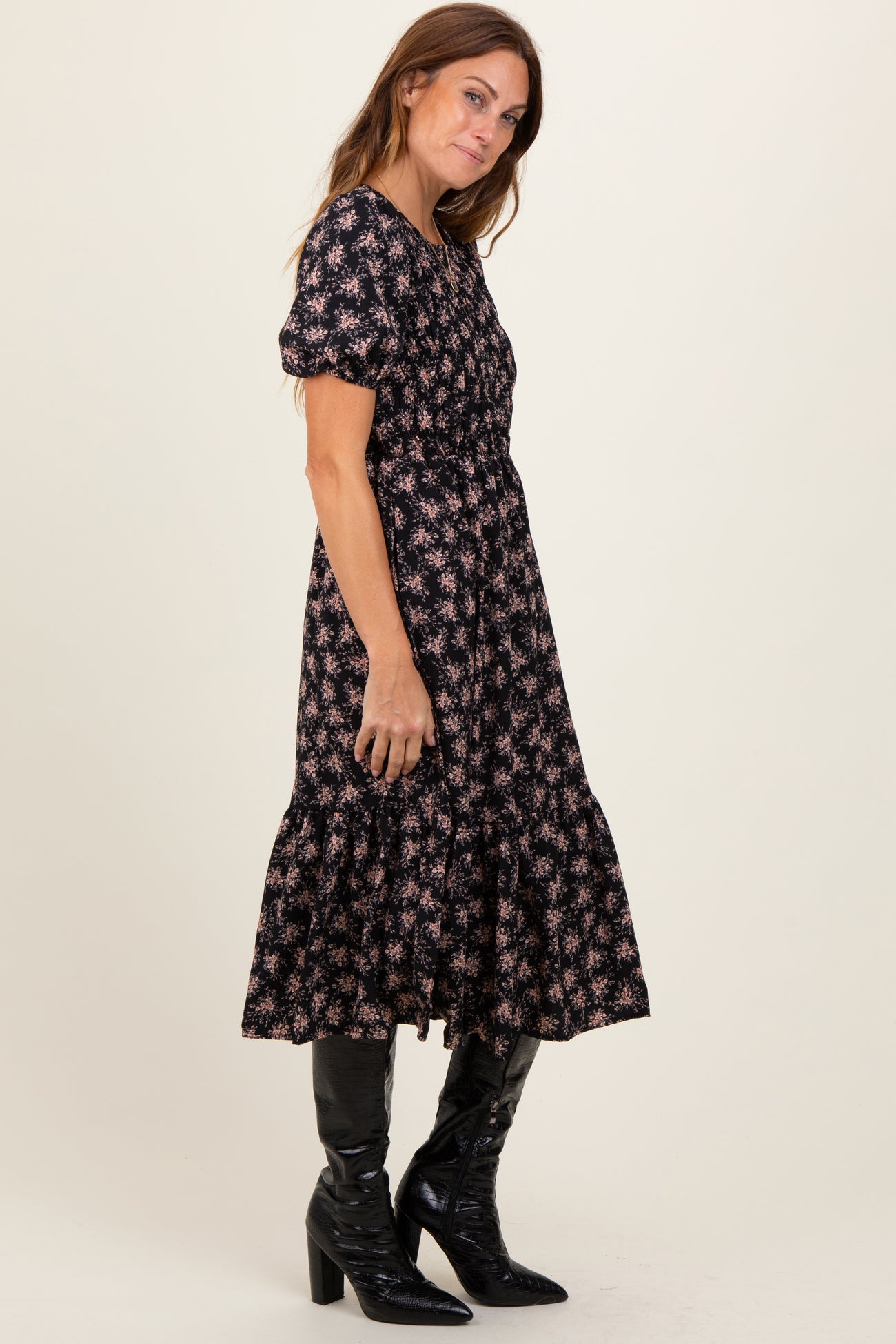 Black Floral Puff Sleeve Smocked Midi Dress