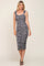 A ribbed knit, floral printed midi dress featuring a v-neckline, ruched front, back and sides and adjustable tie straps.