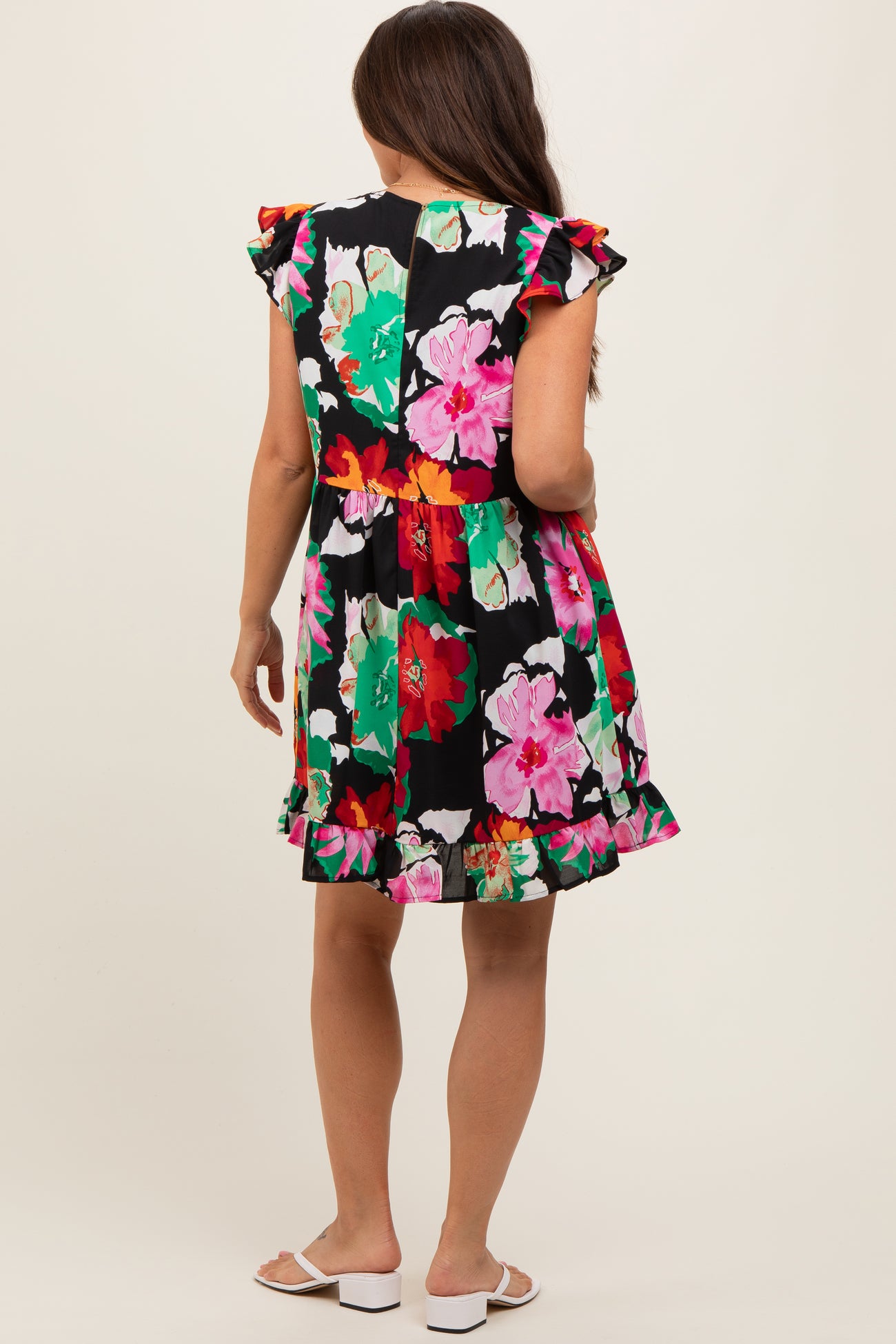A floral print maternity dress featuring a v-neckline, ruffle shoulders, a keyhole back with a button closure, an empire waist, a ruffle hem, and double lining.
