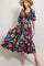 Black Floral Satin Smocked Short Sleeve Midi Dress