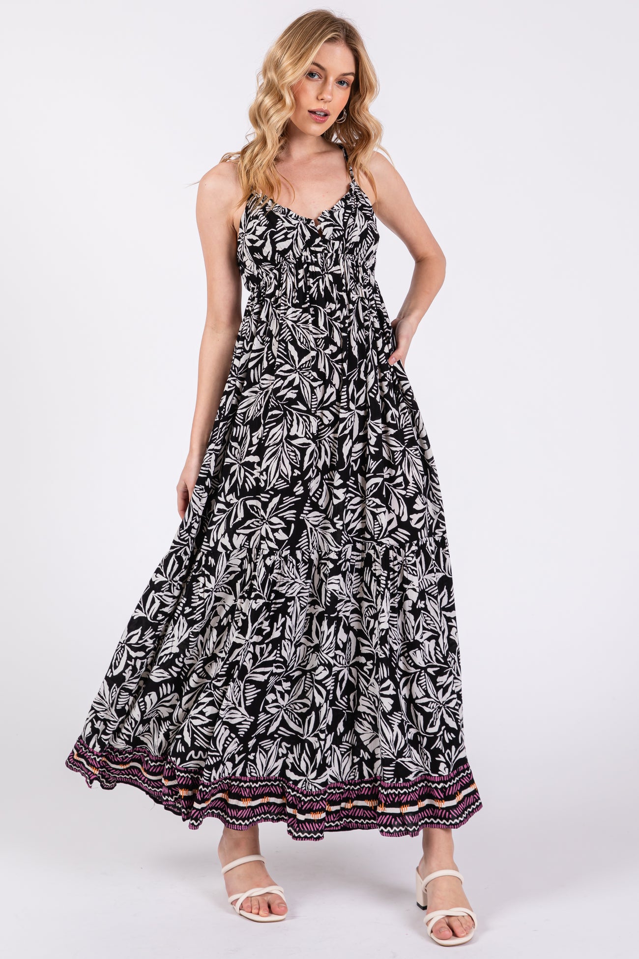 A floral maternity maxi featuring a ruffle trim v-neckline, adjustable straps with a back tie, and a gathered contrast bottom tier.