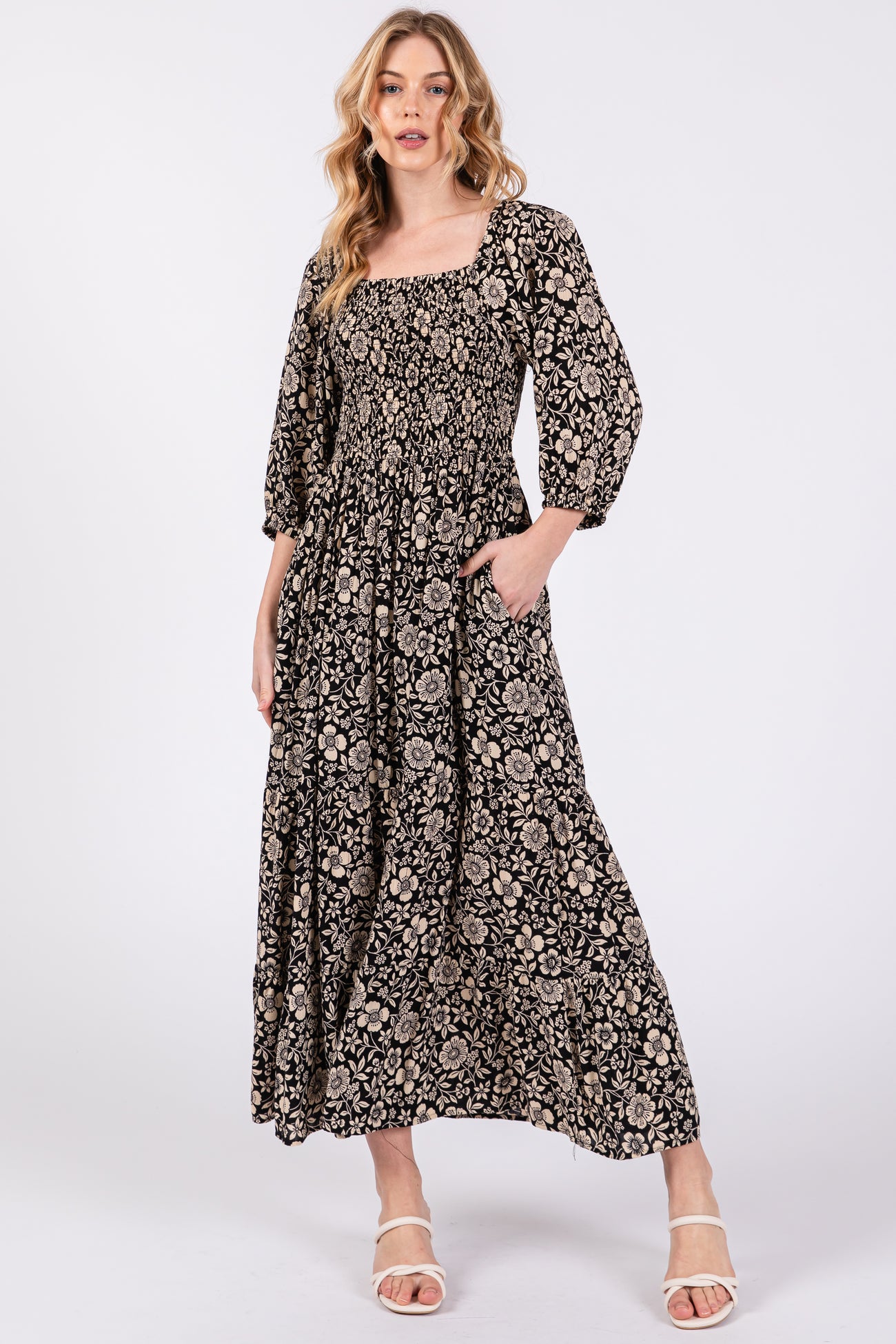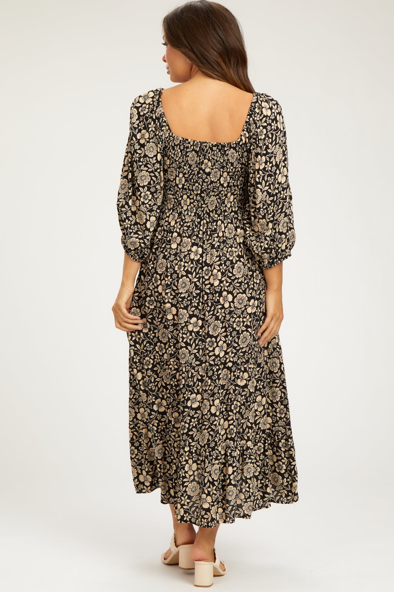 A floral maternity midi dress with a squared neckline, half-length puff sleeves, a smocked top, side pockets, and a tiered skirt.