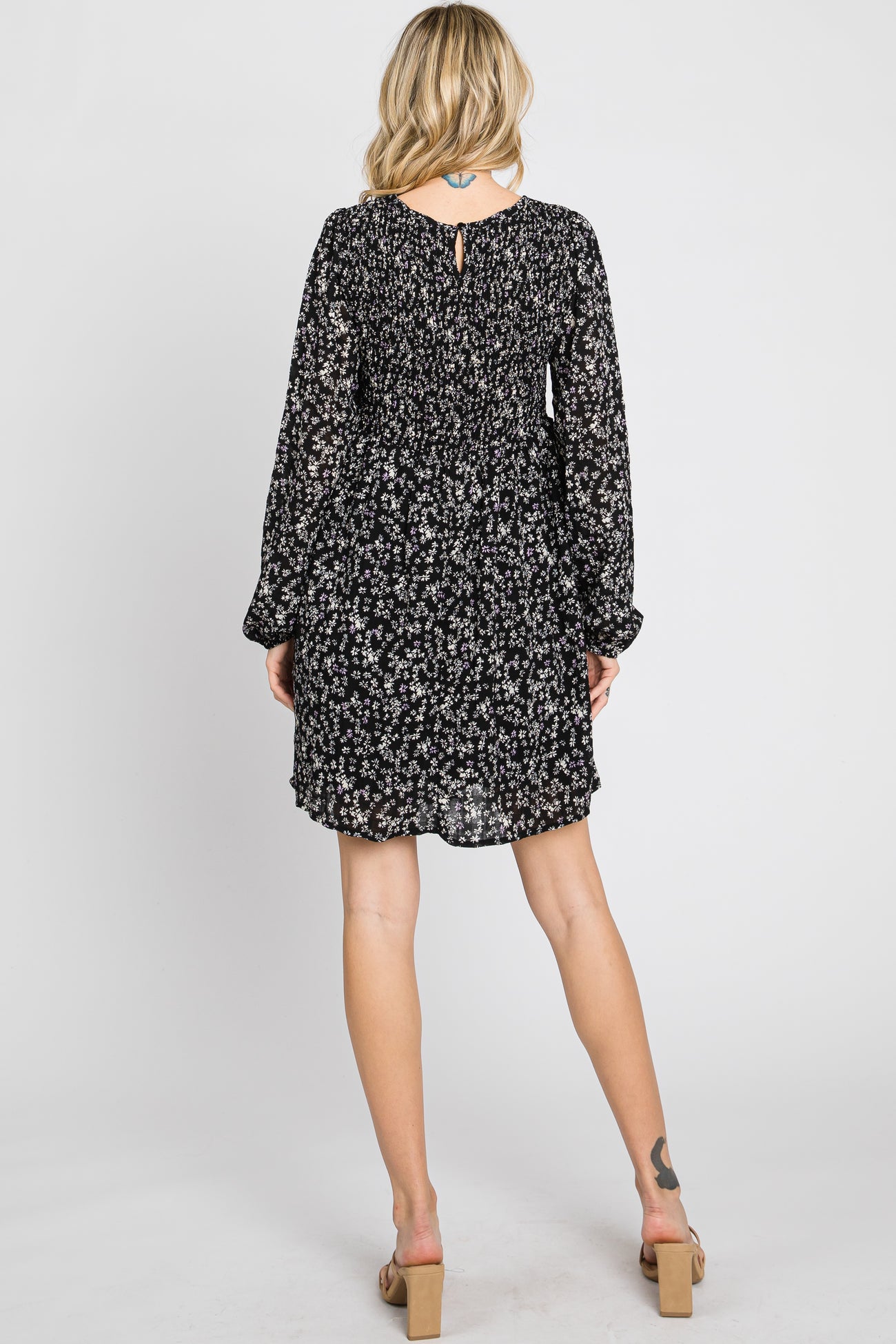 Black floral dress with a rounded neckline, a smocked bodice, long sleeves, and a back keyhole button closure. Skirt is lined.