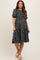 A floral print maternity midi dress with a smocked bust, puff sleeves, and ruffle hem. Pocketed.