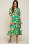 A floral maternity dress featuring a smocked body, a squared neckline, a gathered bottom tier, and cinched puff sleeves with ties.