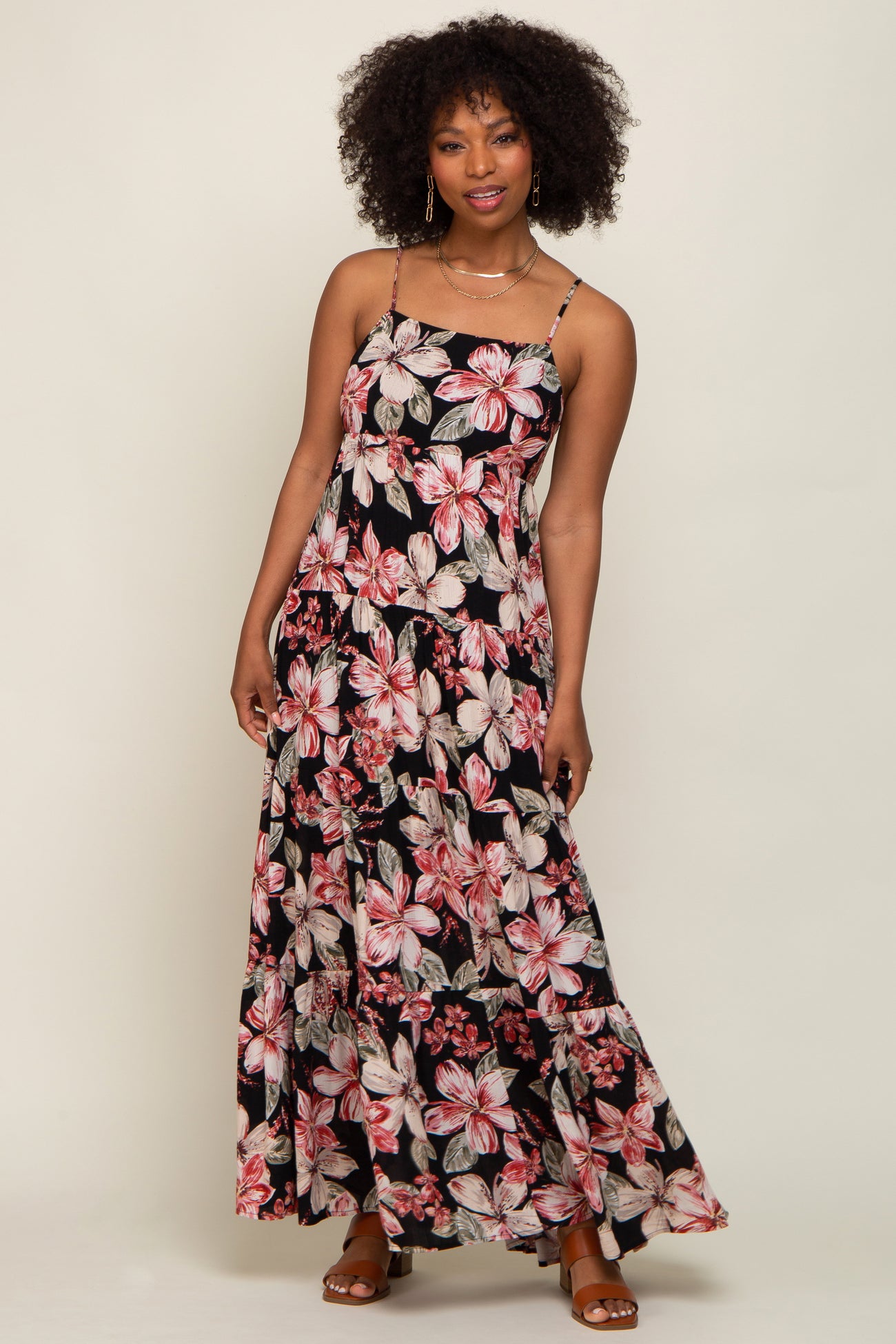A floral print maxi dress featuring a square neckline, adjustable cami straps, a back zipper, a tiered skirt, and double lining.