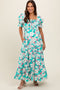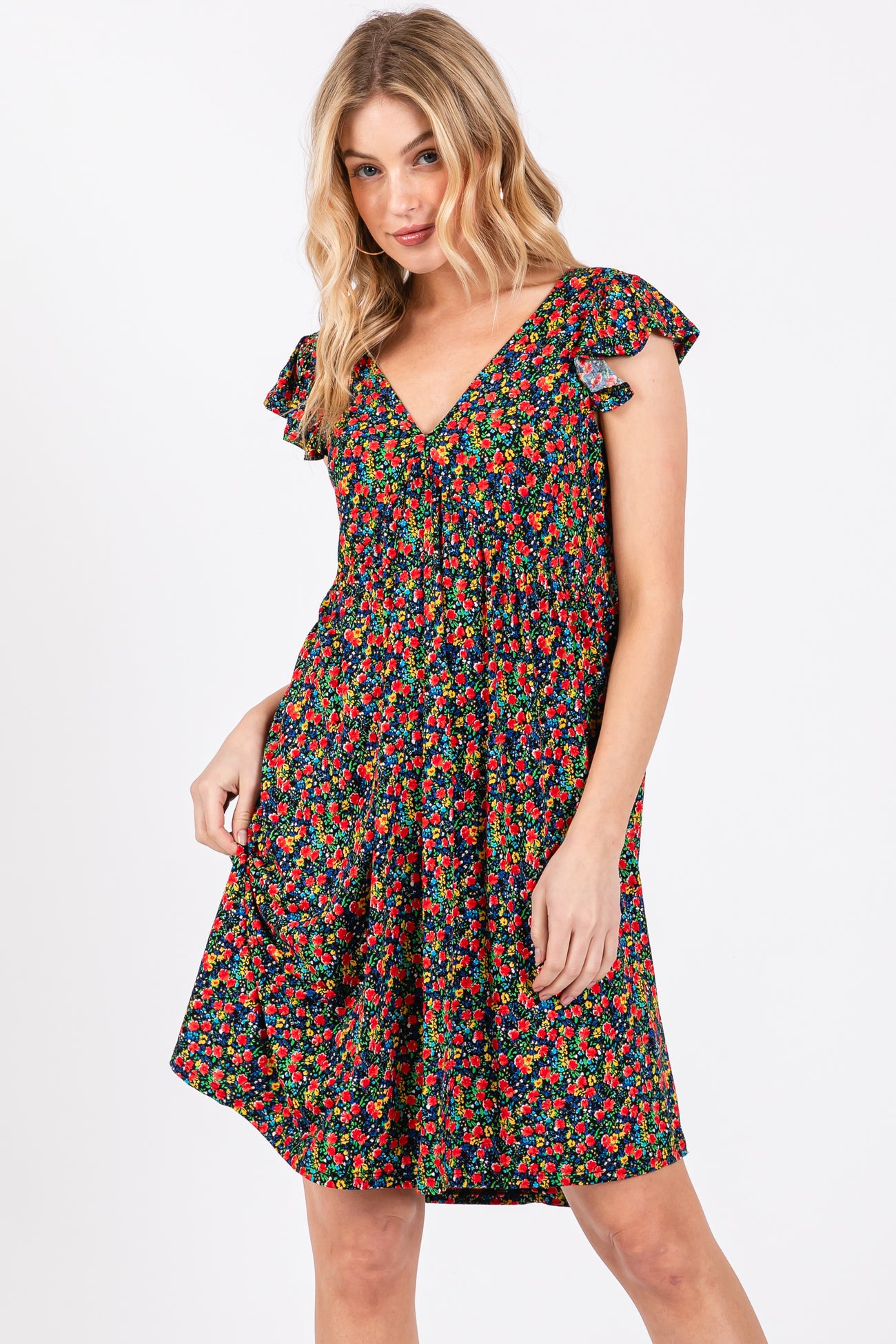 Floral maternity dress with a v-neckline, and ruffle short sleeves.