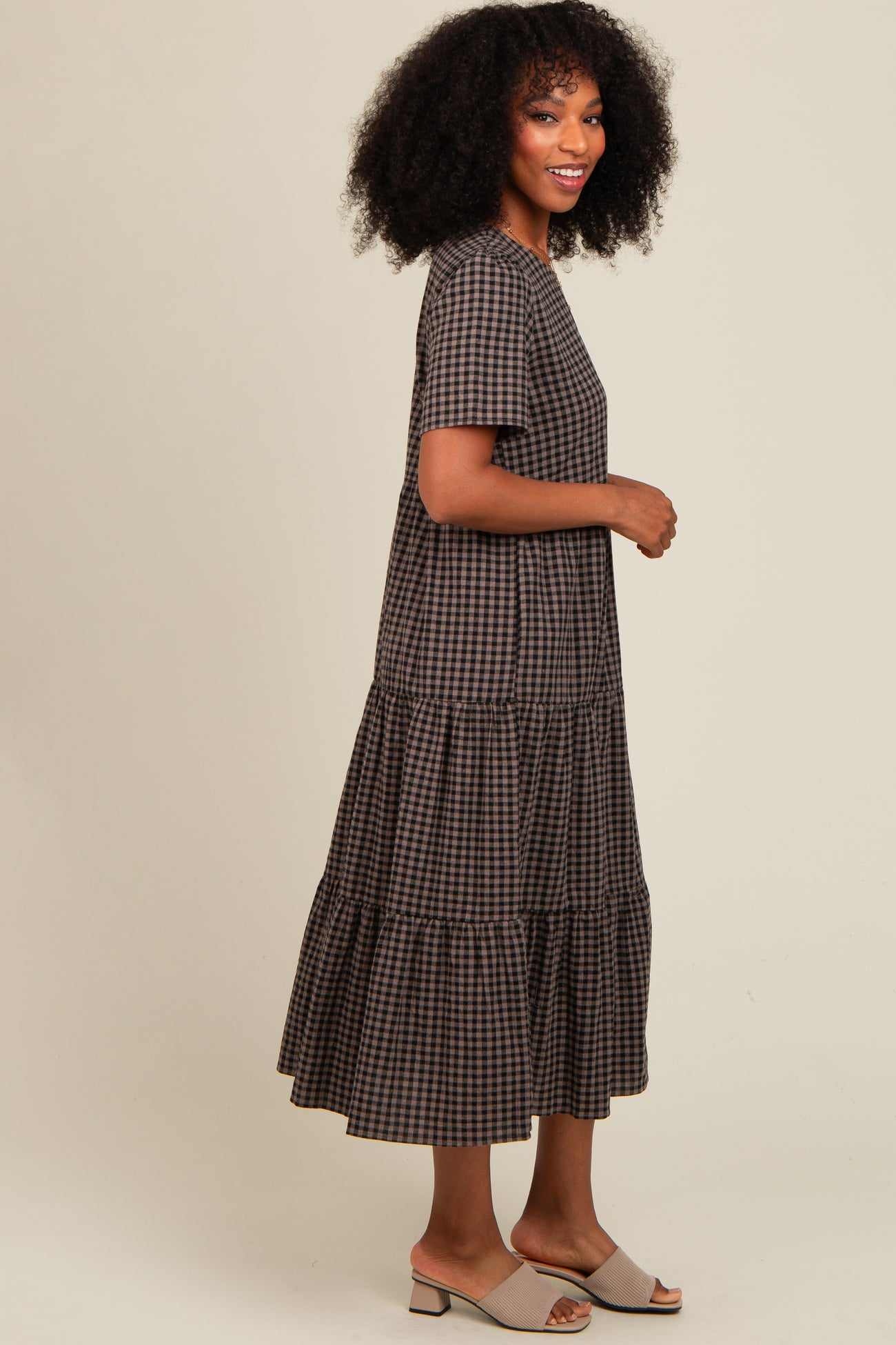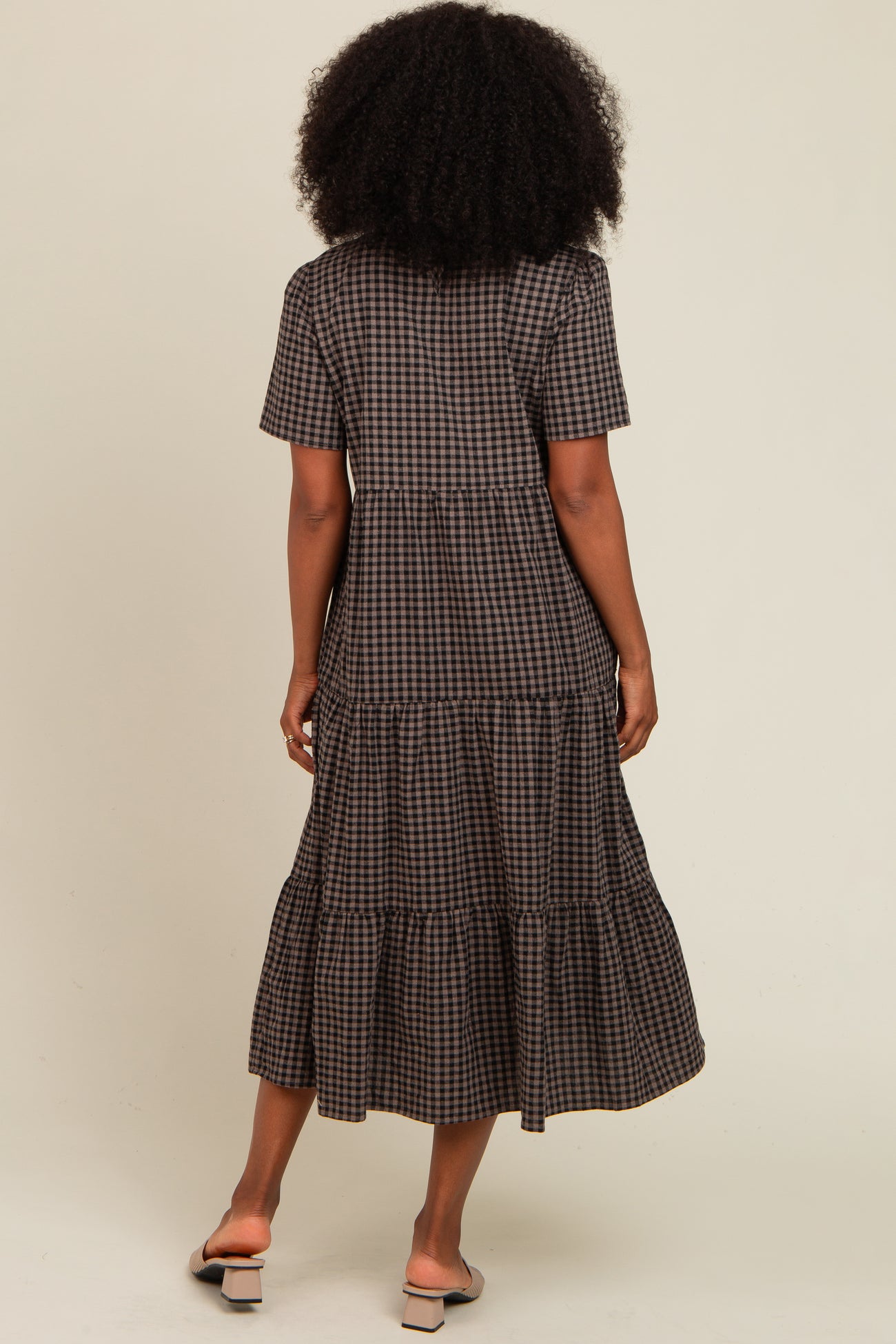 Elevate your everyday style with our Black Gingham Tiered Midi Dress. Featuring a classic gingham pattern in chic black and brown tones, this dress offers a flattering tiered silhouette that flows beautifully to midi length. Designed with short sleeves and a round neckline, it's perfect for effortless day-to-night looks. Crafted from lightweight, breathable fabric, it ensures all-day comfort and movement. Pair with sandals for casual outings or dress it up with heels and accessories for a polished finish. A versatile wardrobe essential blending timeless charm with modern ease.