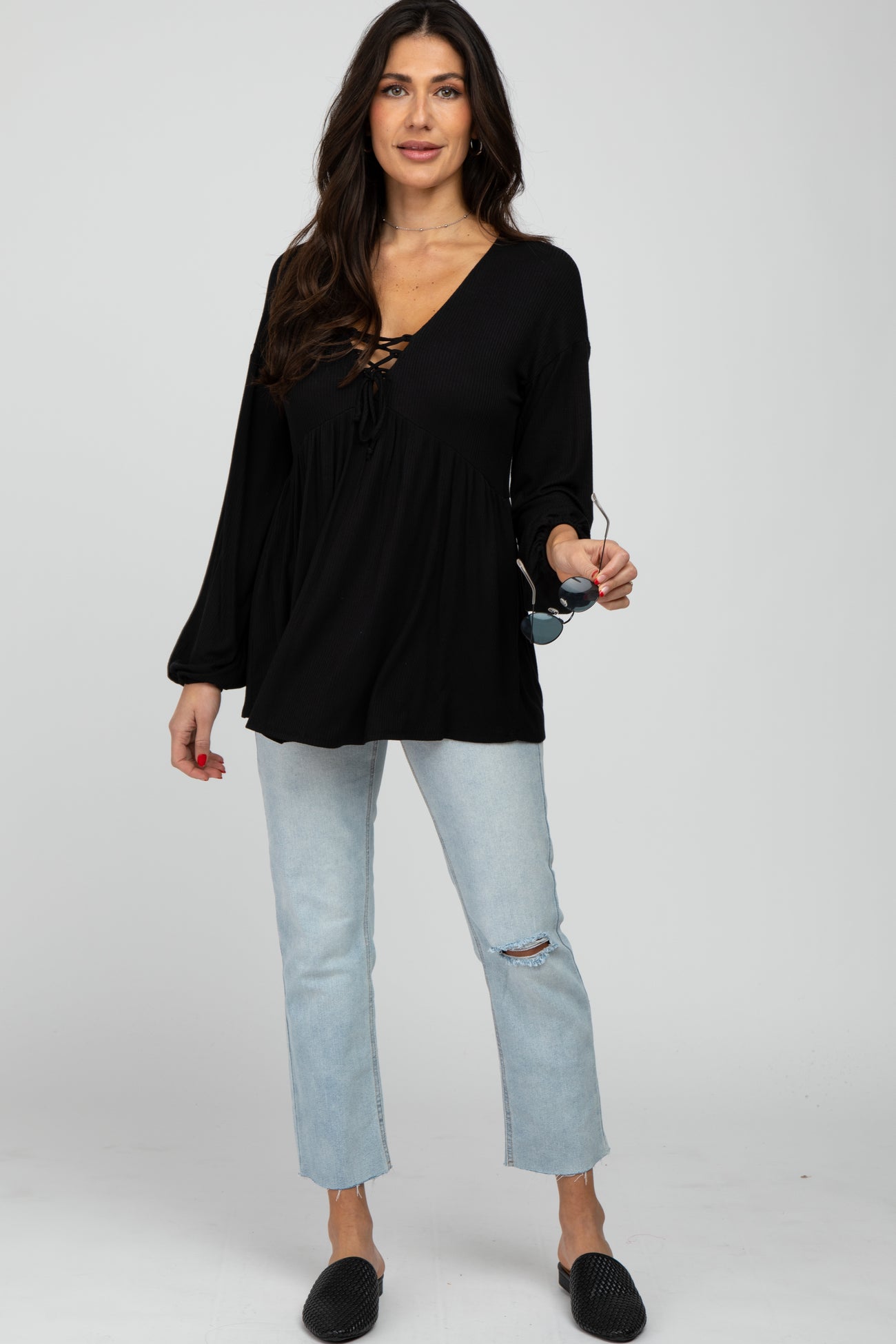 Black Lace-Up Front Long Sleeve Babydoll Top