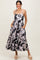 A satin leaf print midi dress featuring a square neckline, adjustable cami straps, a back zipper, an empire waist and double lining.