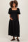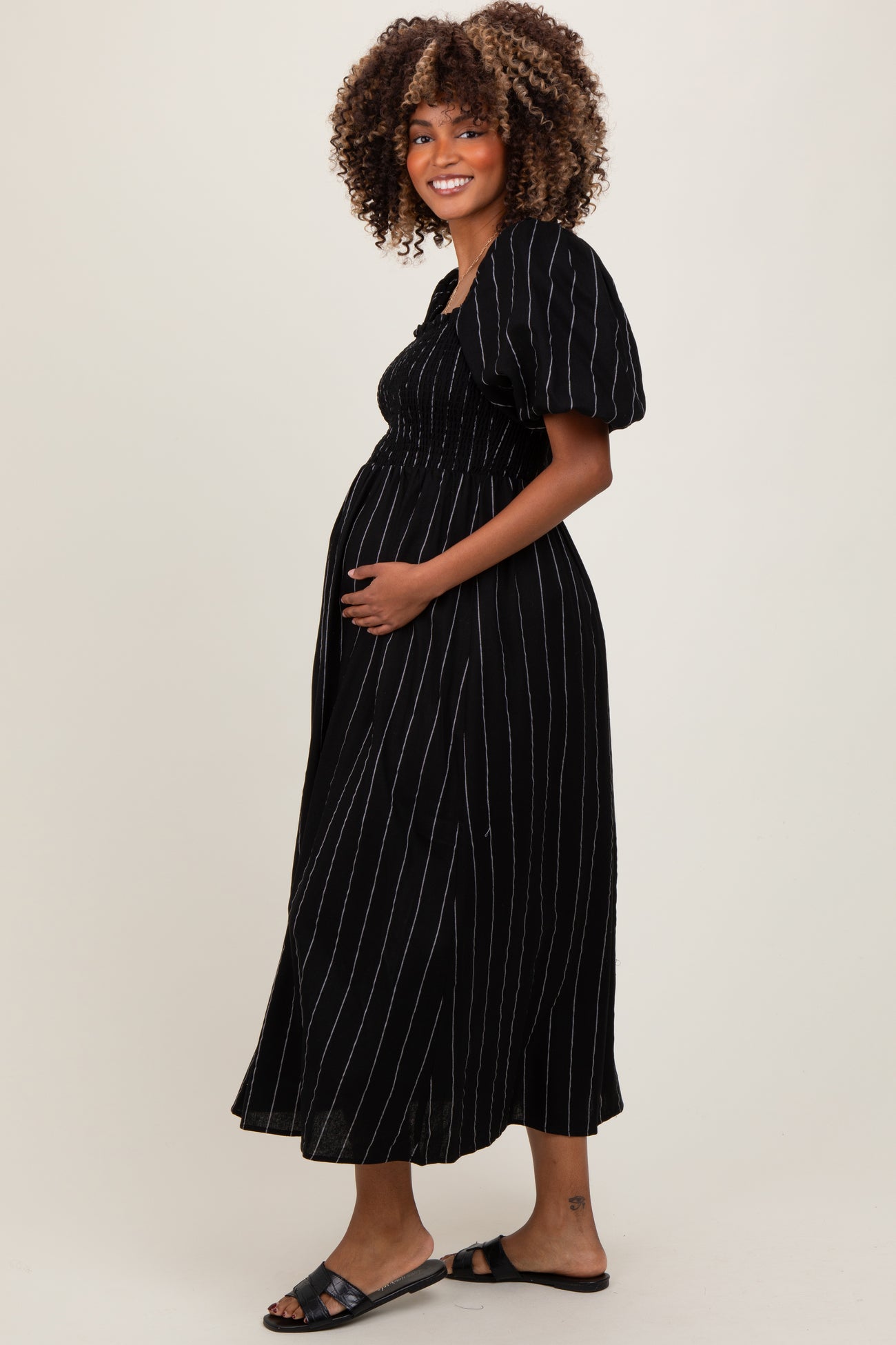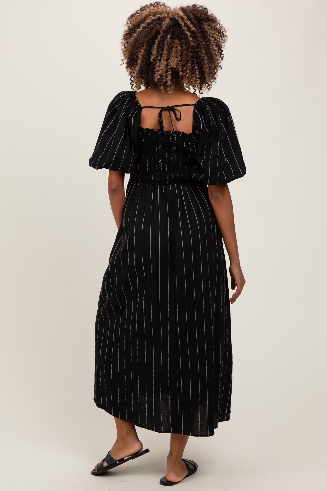Black Linen Stripe Puff Sleeve Maternity Midi Dress