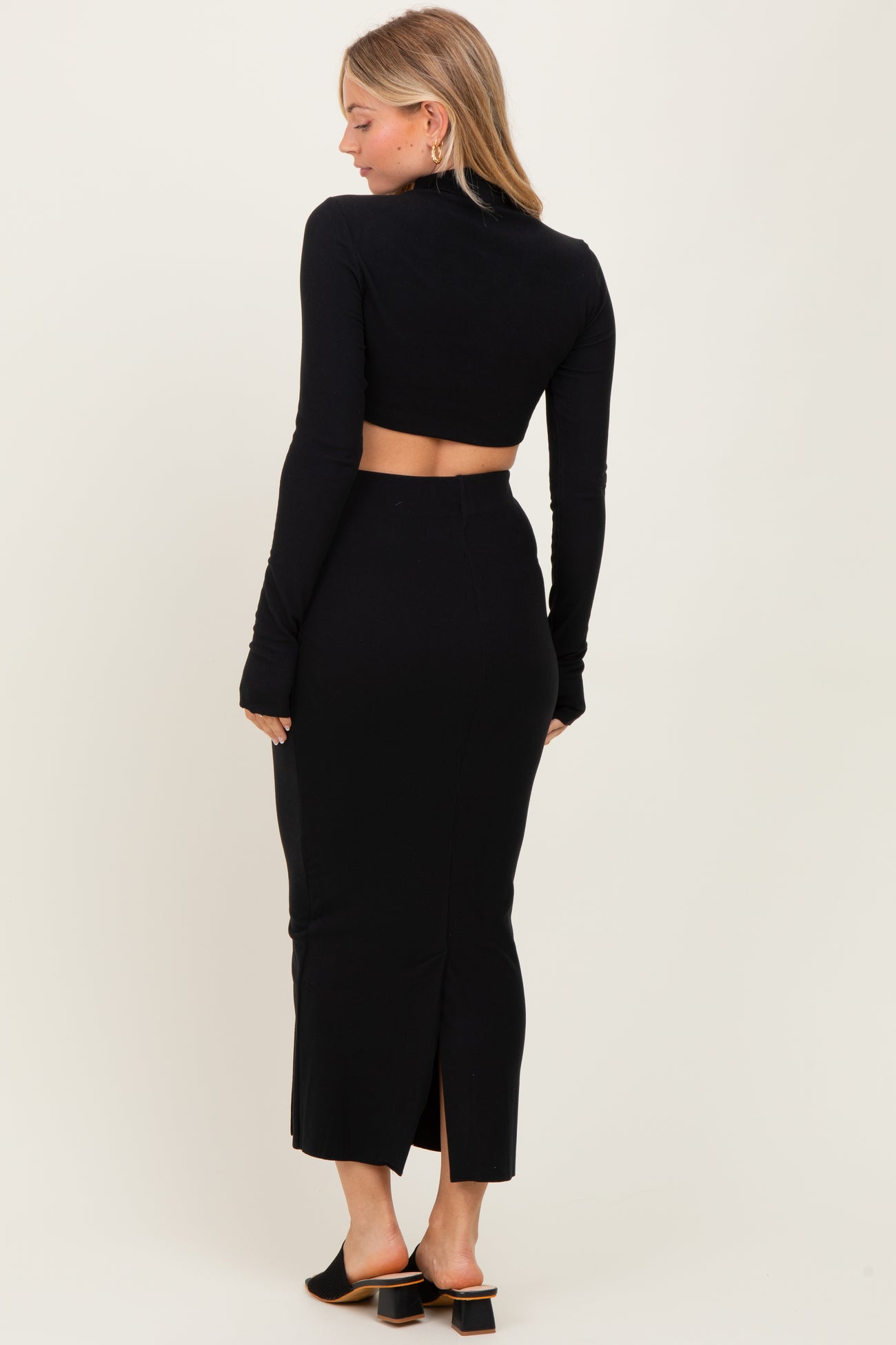 Black Mock Neck Long Sleeve Crop Midi Skirt Set