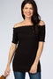A solid hued fitted maternity top featuring a ribbed texture, an off shoulder neckline, fitted sleeves and a lettuce trim.