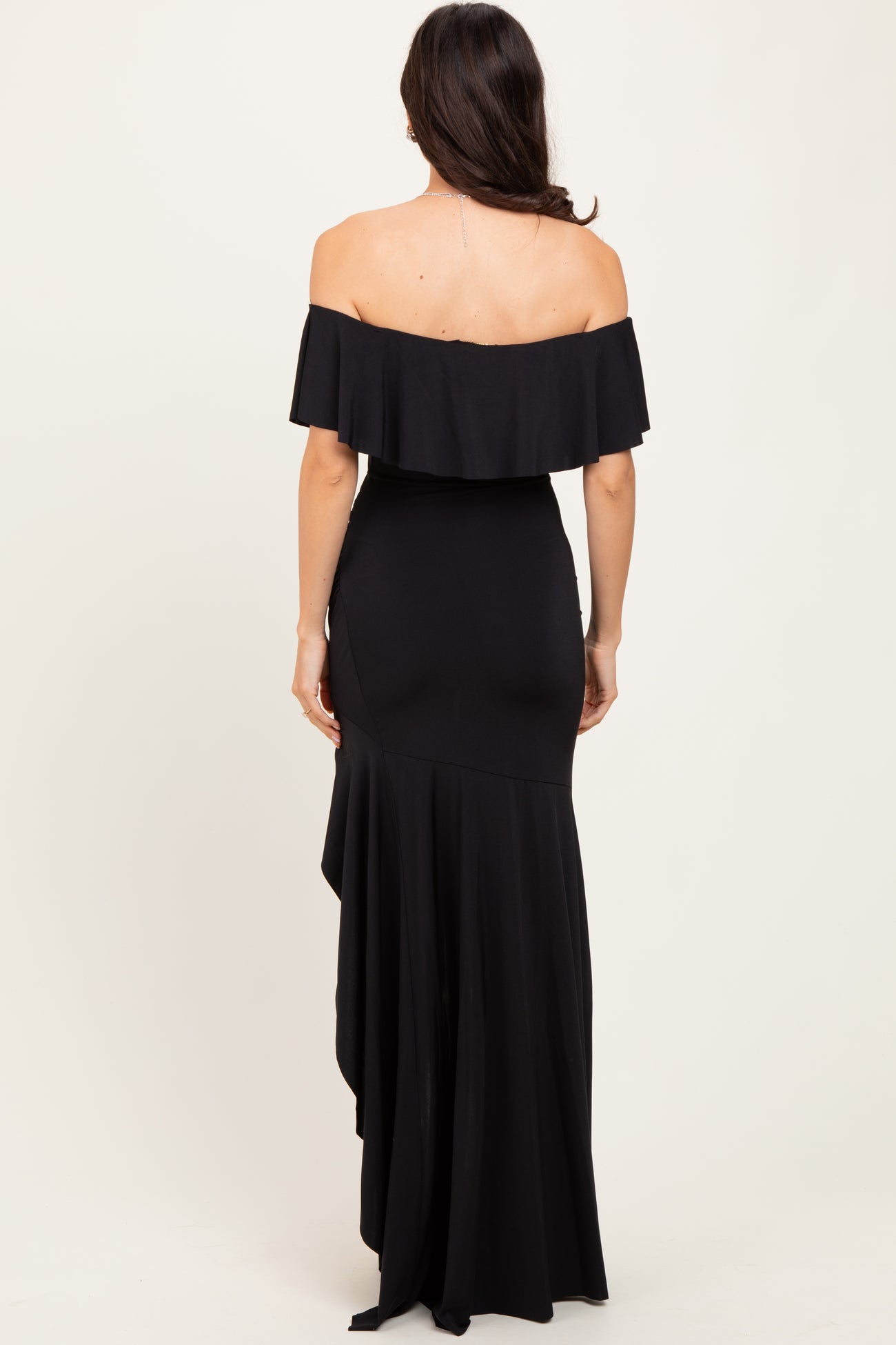 Black Off Shoulder Ruffle Hi-Low Maxi Dress