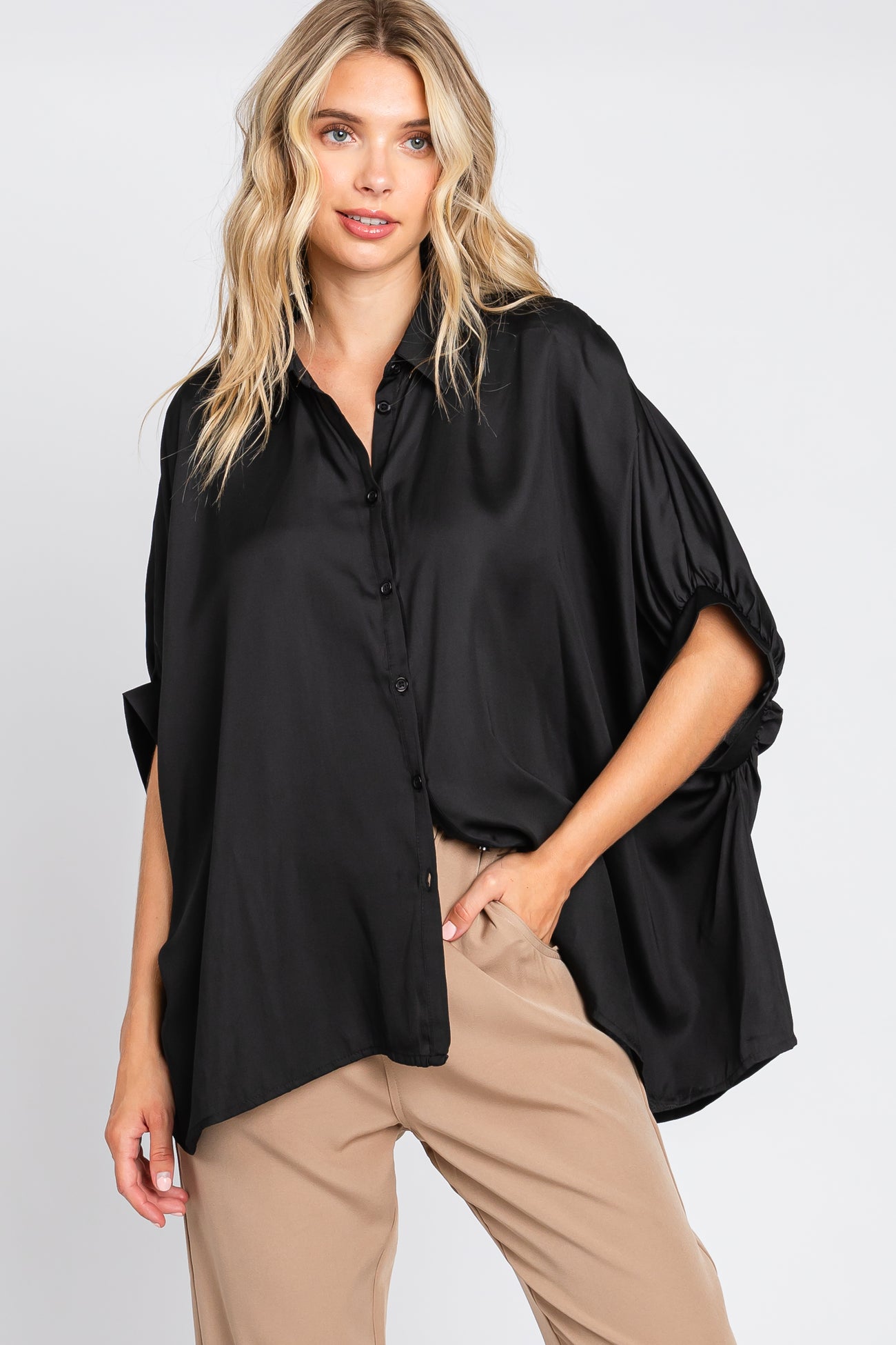 An oversized maternity blouse featuring a collared neckline and a button down front.