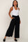 A solid pair of pants in a wide leg style with a pull on elastic waistline with ruffle and tie detail. Pocketed.
