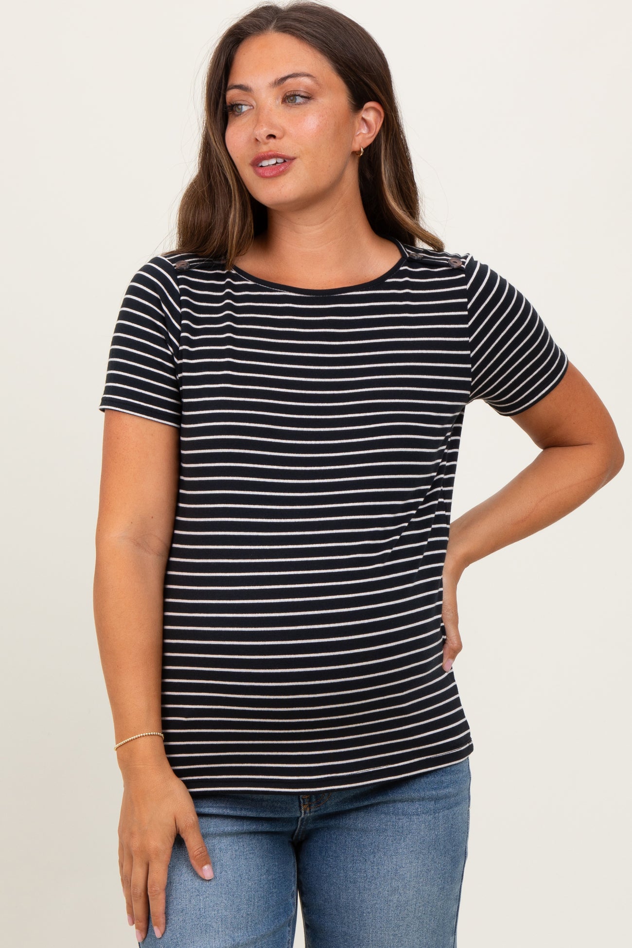 Black Pinstripe Shoulder Button Detail Maternity Top