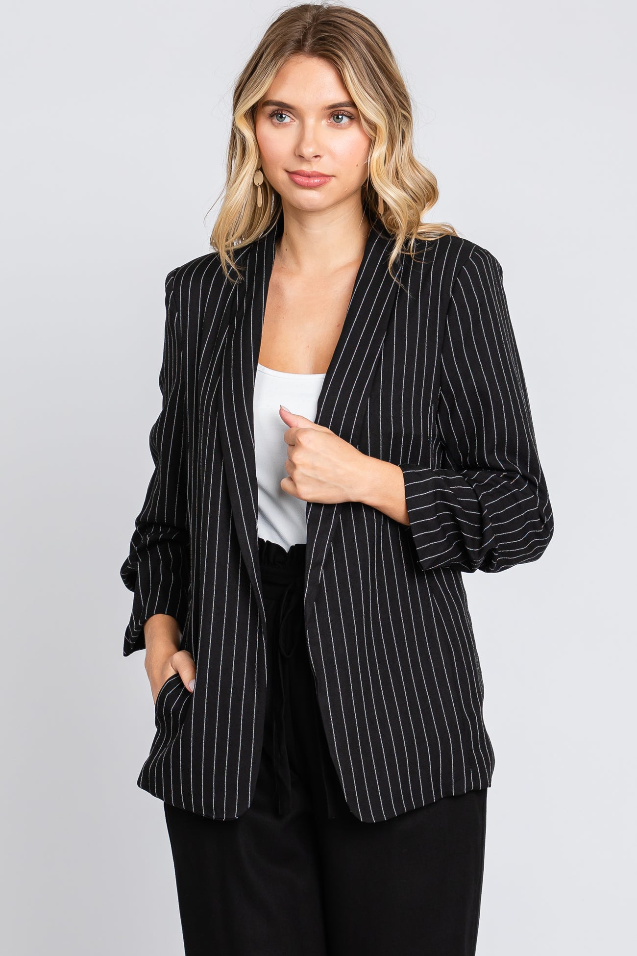 A pinstriped blazer featuring 3/4 length ruched sleeves and side pockets.