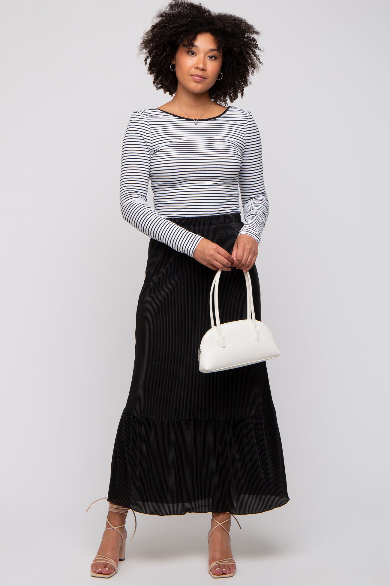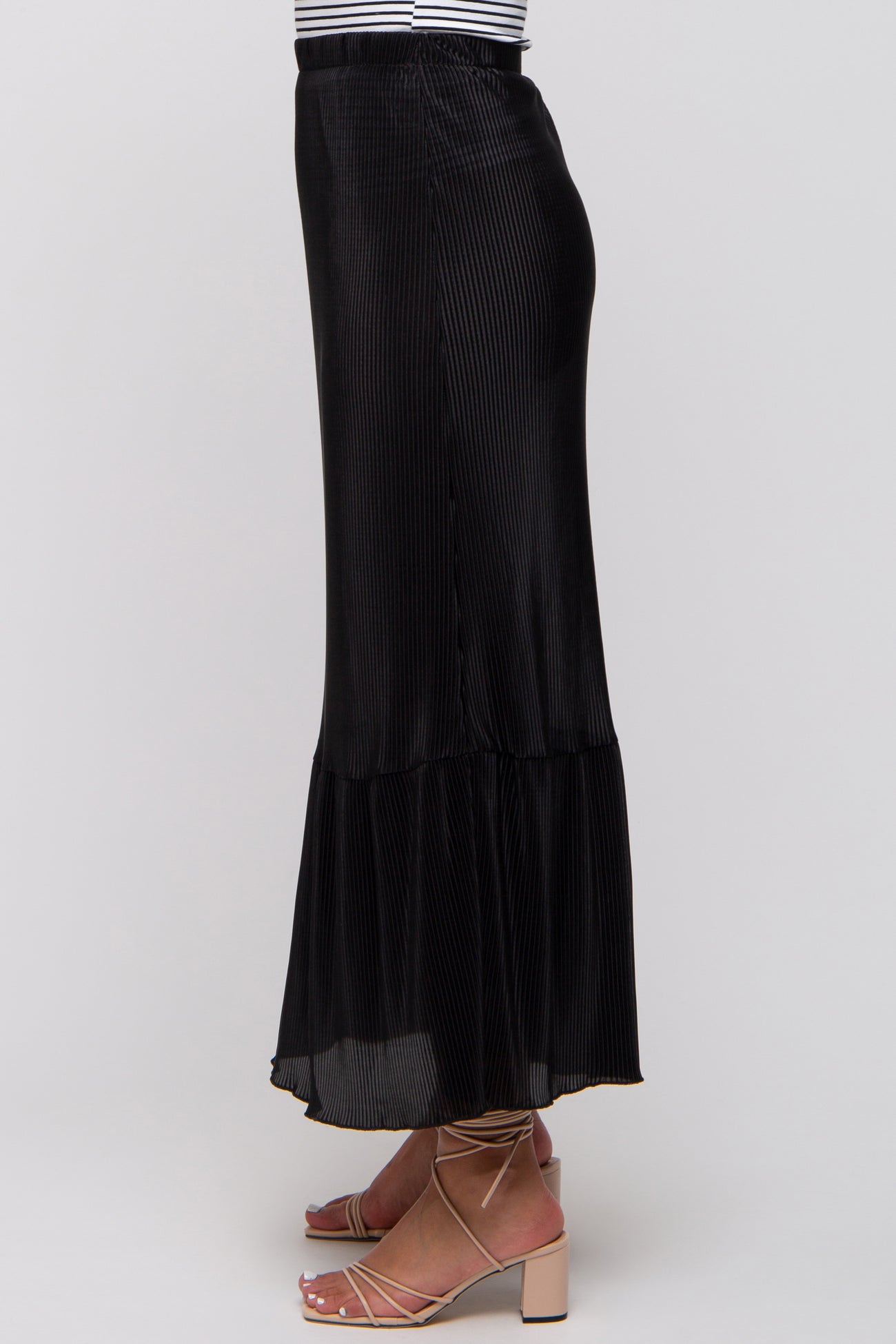 A solid pleated maxi skirt with an elastic waistband and ruffle hem.