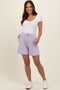 A solid pair of maternity shorts with an elastic waistband with drawstring, raw hem accents and hem. Pocketed.