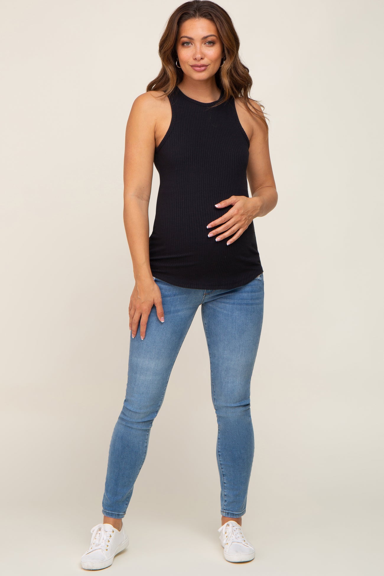A basic solid maternity tank top in a ribbed material with a higher neckline and rounded hem.