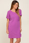 A soft ribbed knit maternity dress featuring a crew neckline, a front pocket and short dolman sleeves.