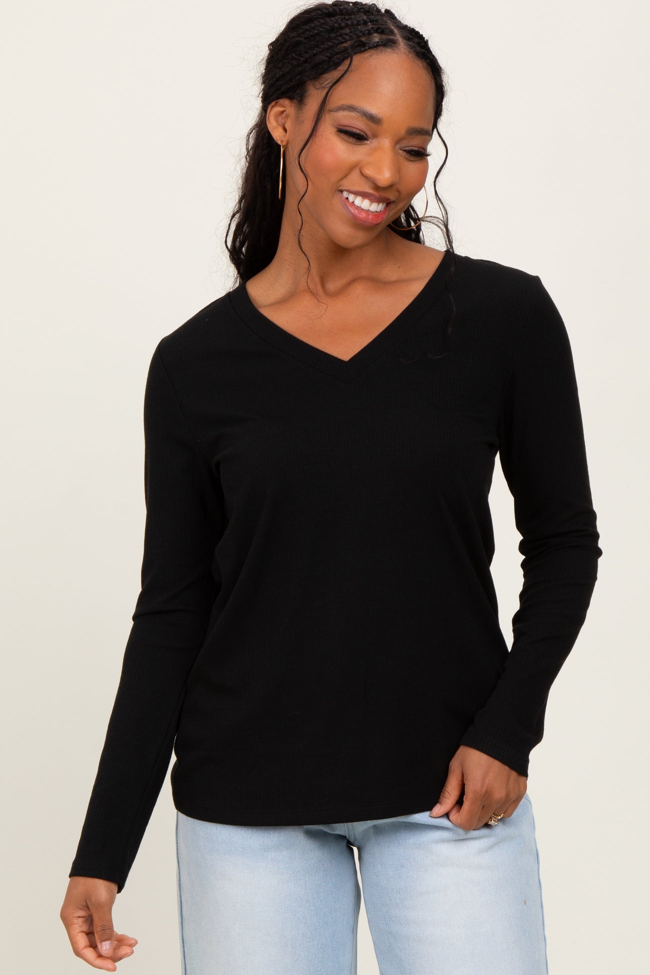 Black Ribbed Knit V-Neck Long Sleeve Top