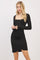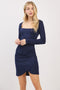 Elevate your style with this Black Ribbed Long Sleeve Ruched Tulip Skirt Dress. Featuring a flattering square neckline and soft ribbed fabric, this dress hugs your curves beautifully. The ruched detailing at the waist enhances your silhouette, while the tulip skirt adds a chic, feminine touch. Long sleeves provide coverage with a sleek, modern look, perfect for day-to-night wear. Comfortable and versatile, pair it with heels for a night out or boots for a casual yet polished vibe. A must-have staple for your wardrobe that effortlessly combines elegance with everyday wearability. Available in multiple sizes.