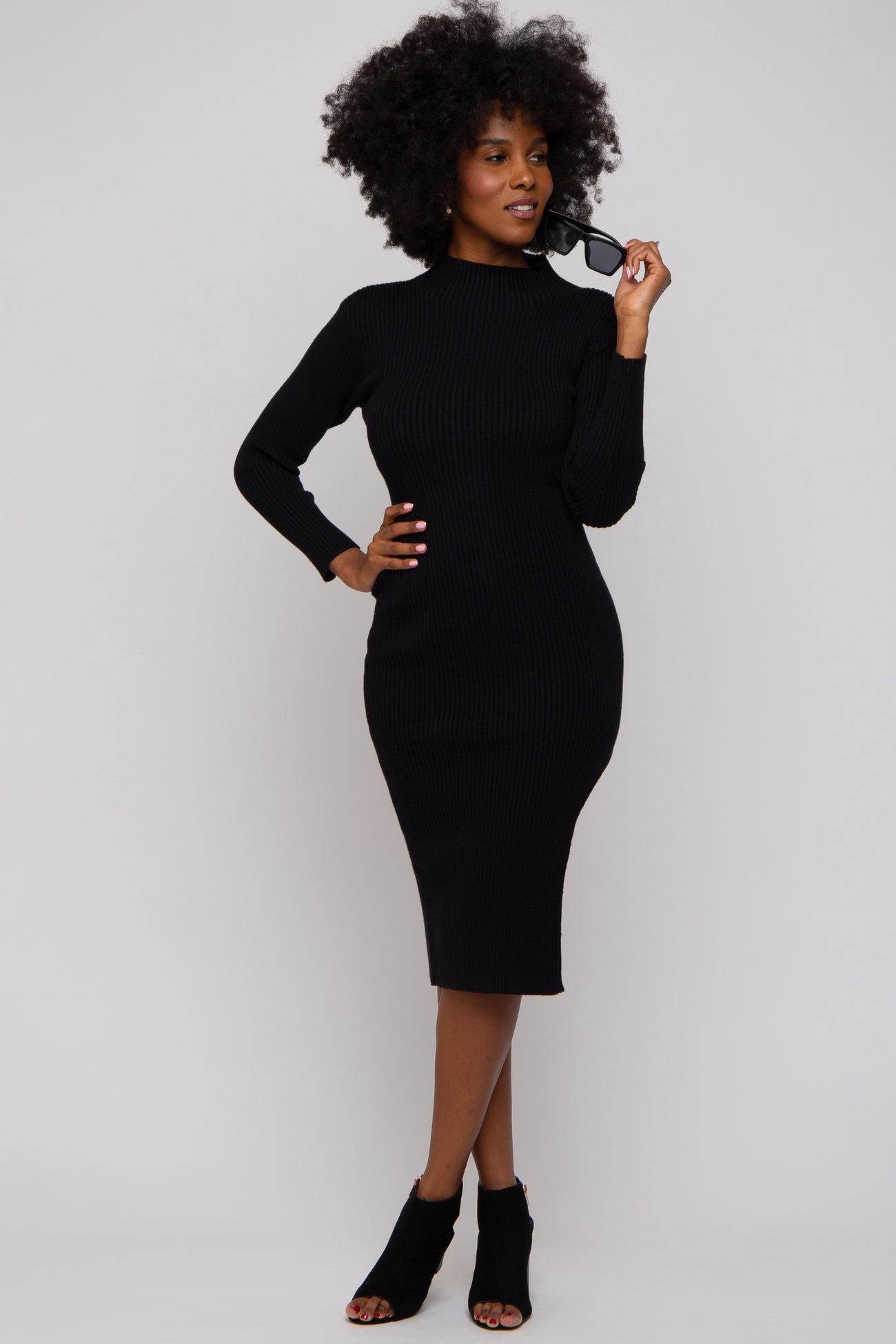 Black Ribbed Mock Neck Side Slit Midi Dress