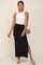 A ribbed midi skirt featuring an elastic waistband and a side slit.