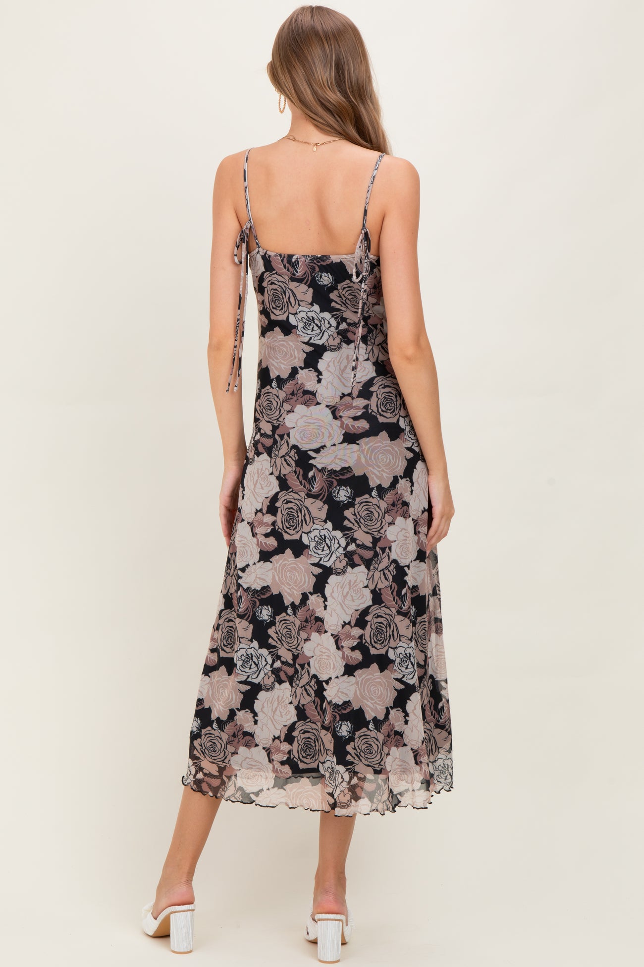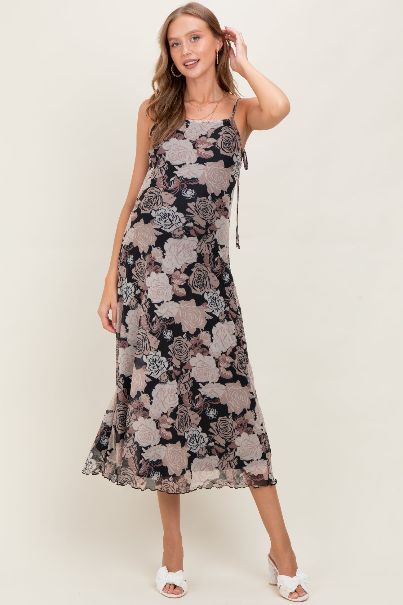 Black Rose Print Mesh Sleeveless Maternity Midi Dress