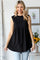 Elevate your wardrobe with this chic Black Ruffle Mock Neck Sleeveless Blouse. Crafted from lightweight textured fabric, it features a flattering mock neck with delicate ruffle trim and a loose, flowy fit that drapes beautifully. Perfect for warm days or layering under jackets, this blouse pairs effortlessly with jeans or skirts for a versatile look. Its sleeveless design keeps you cool while maintaining polished style for both casual outings and dressier occasions. Add a touch of feminine charm to your collection with this must-have top that combines comfort and elegance seamlessly. Available in multiple sizes.