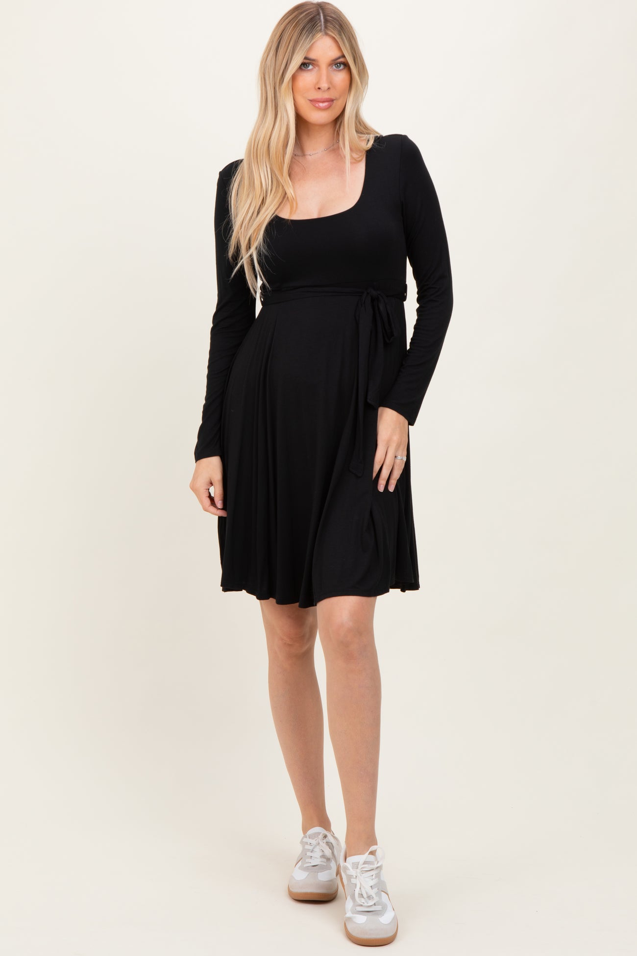 Black Scoop Neck Long Sleeve Waist Tie Dress