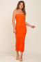 A solid midi dress featuring a shirred gathered top, adjustable shoulder ties, a ruffle accent along the waist, and side pockets. Dress is lined.