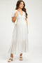 A solid hued maternity midi dress featuring a smocked top, short flutter sleeves, a ruffle hem and a v-neckline.