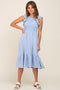 A midi dress featuring a rounded neckline, a smocked elastic top, layered ruffle flutter sleeves and a ruffle hem.