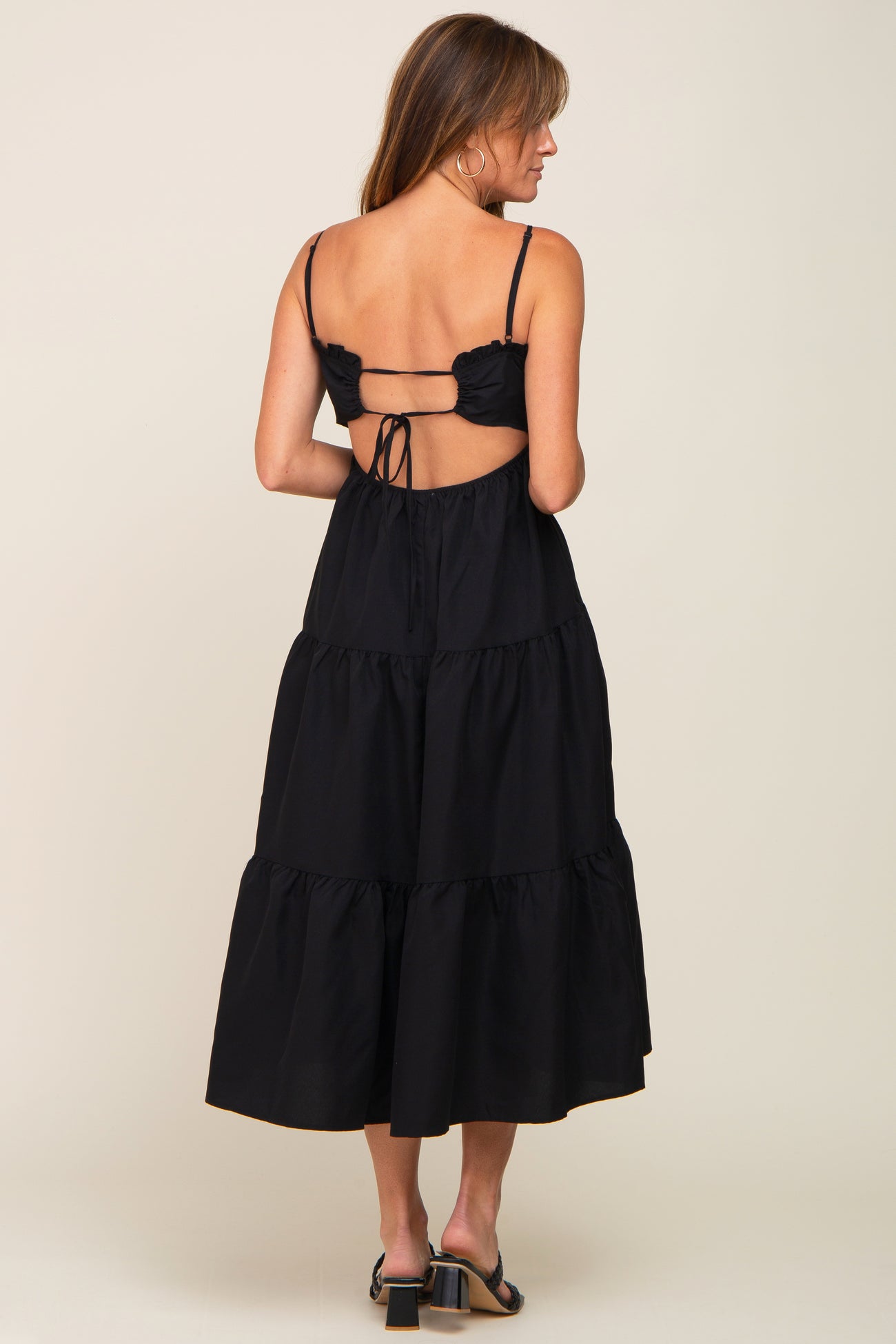 A midi dress featuring a smocked top, adjustable cami straps, back cutouts with an adjustable tie, side pockets and a tiered skirt.