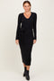 Black Solid Brushed Rib Long Sleeve V-Neck Fitted Maternity Midi Dress