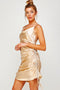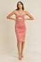 A solid fitted ruched midi dress with front cutout and strap details. Dress is lined.