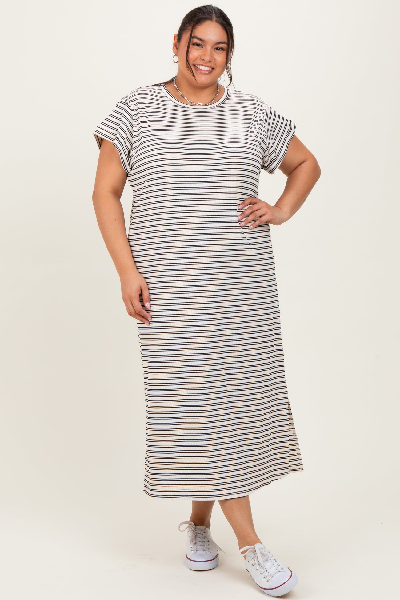 Meet your new go-to for effortless style: the Black Striped Plus Midi T-Shirt Dress! Crafted for ultimate comfort, this chic dress features classic black and white stripes, a flattering midi length, and soft stretch knit fabric that moves with you. The relaxed fit and short sleeves make it perfect for casual days, work-from-home vibes, or weekend adventures. Dress it up with bold accessories or keep it simple with sneakers—versatility at its best! Designed with your curves in mind for a flattering fit you’ll love. Step out in confidence and comfort in this must-have striped t-shirt dress!