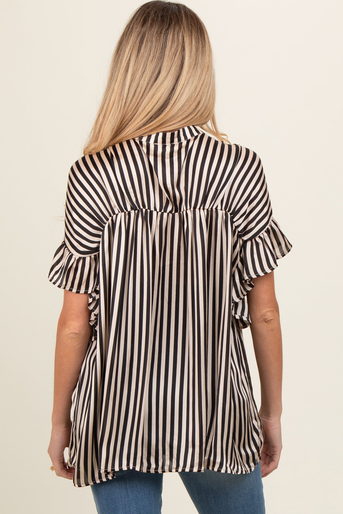 Black Striped Ruffle Sleeve Button Down Maternity Blouse