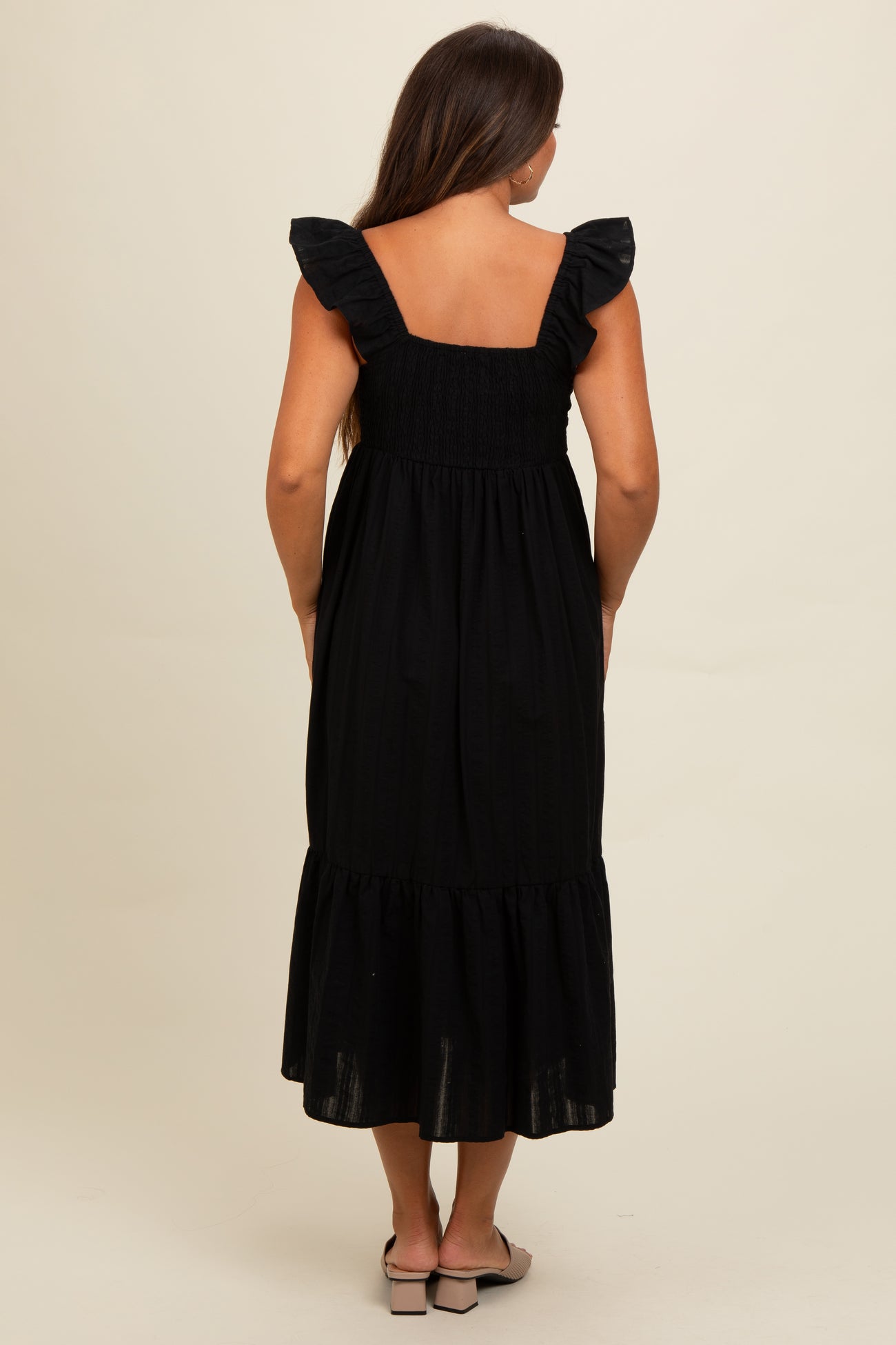 Black Textured Cotton Ruffle Strap Maternity Midi Dress