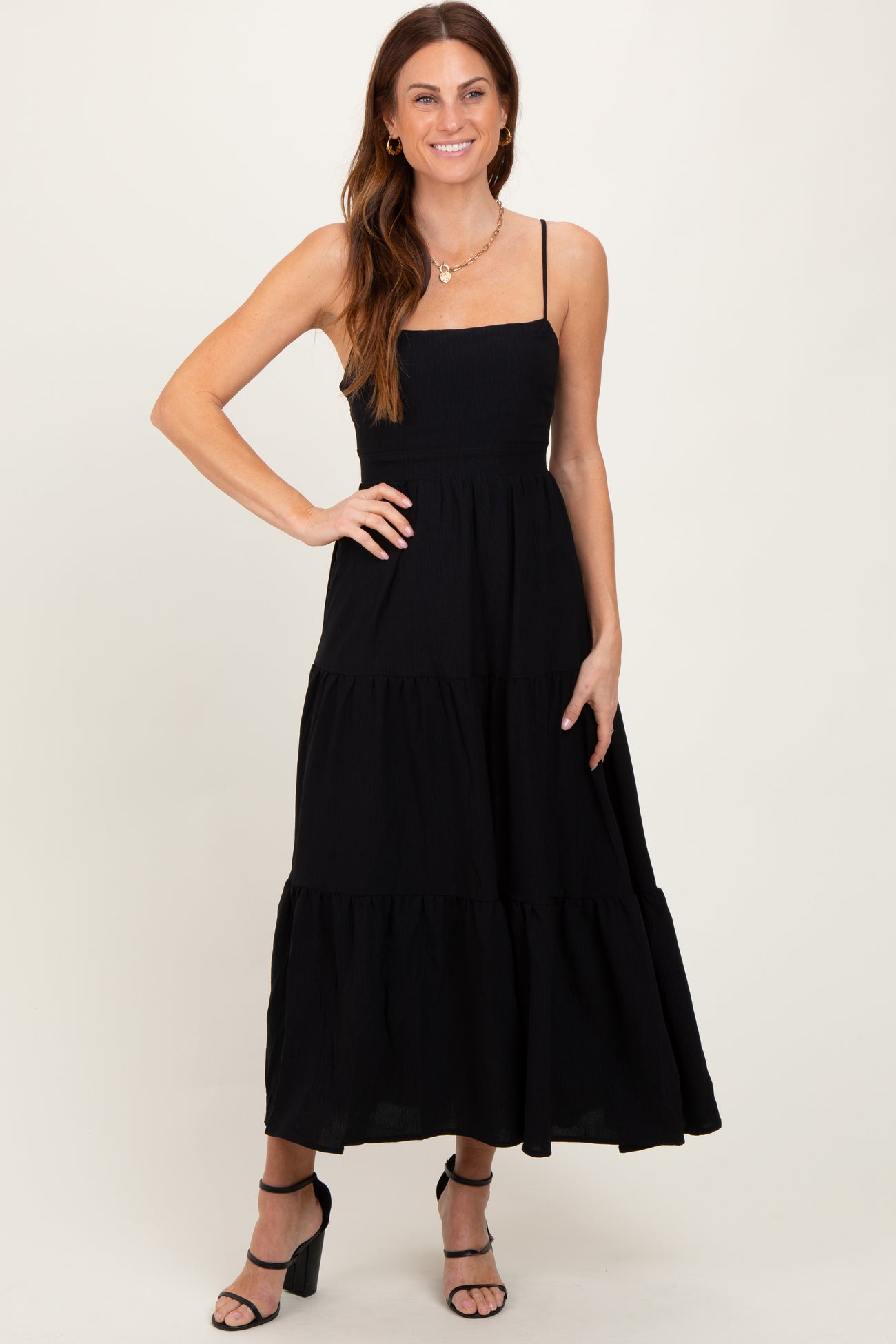 Elevate your maternity wardrobe with our Black Tiered Cutout Tie Back Maternity Midi Dress. Designed with comfort and style in mind, this dress features a flattering tiered skirt that gracefully flows over your baby bump. The delicate spaghetti straps and square neckline offer a chic, feminine touch, while the adjustable tie-back detail at the waist allows for a perfect fit throughout your pregnancy. Made from lightweight, breathable fabric, this midi dress is ideal for any occasion—from casual outings to special events. Embrace effortless elegance and feel confident from bump to baby in this must-have maternity staple.