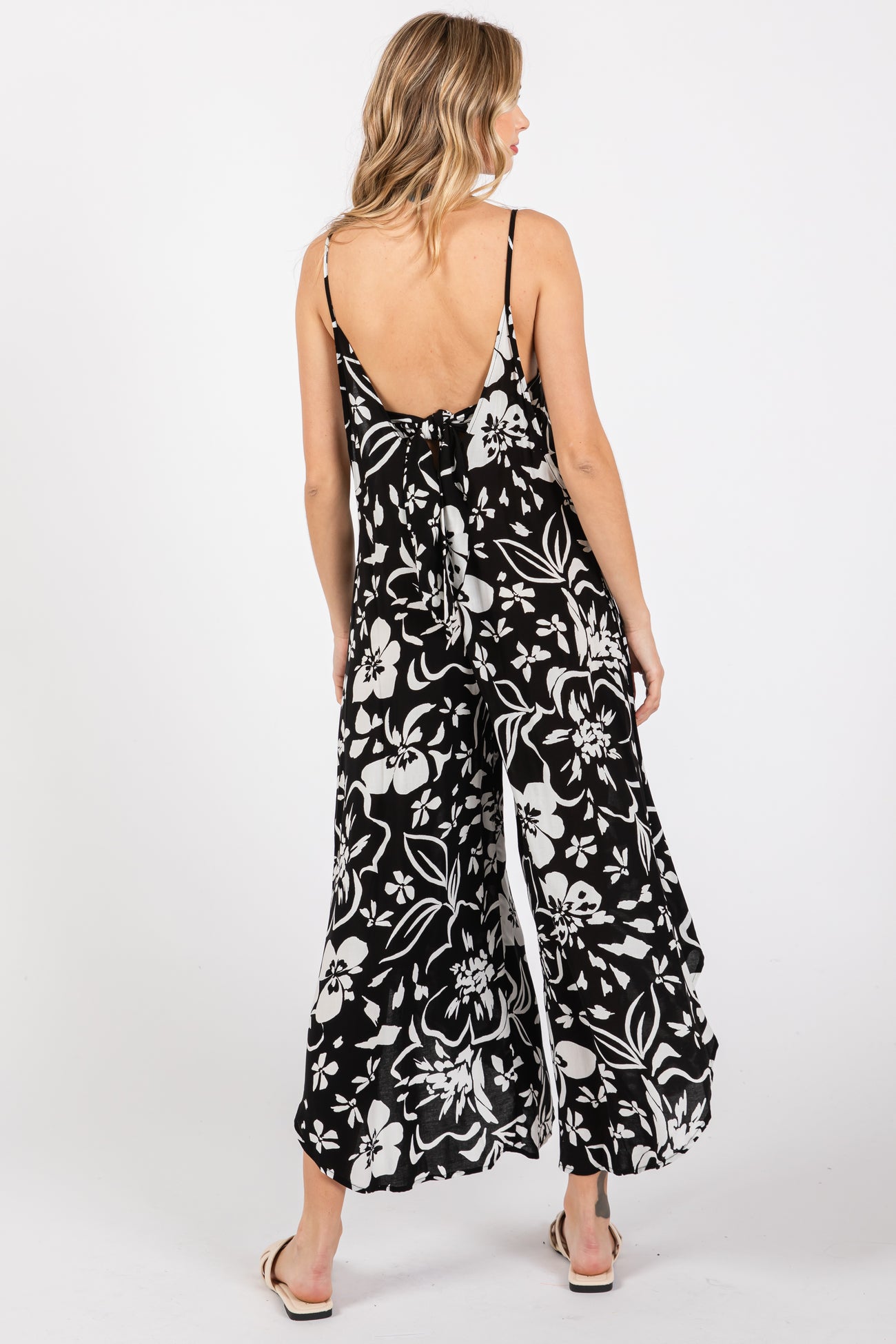 Black Tropical Floral V-Neck Back Cutout Round Hem Jumpsuit
