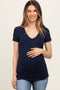 A solid hued maternity top featuring a v-neckline and short sleeves.